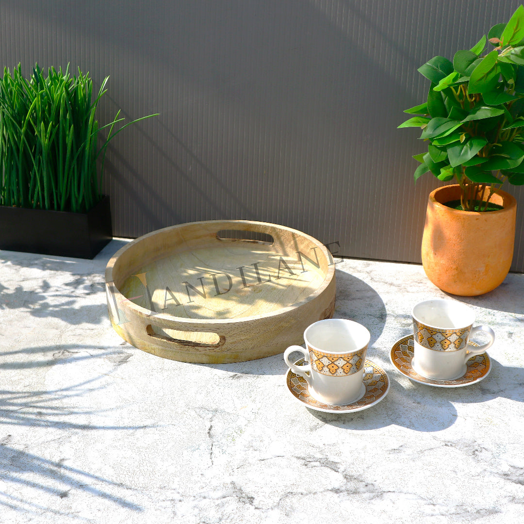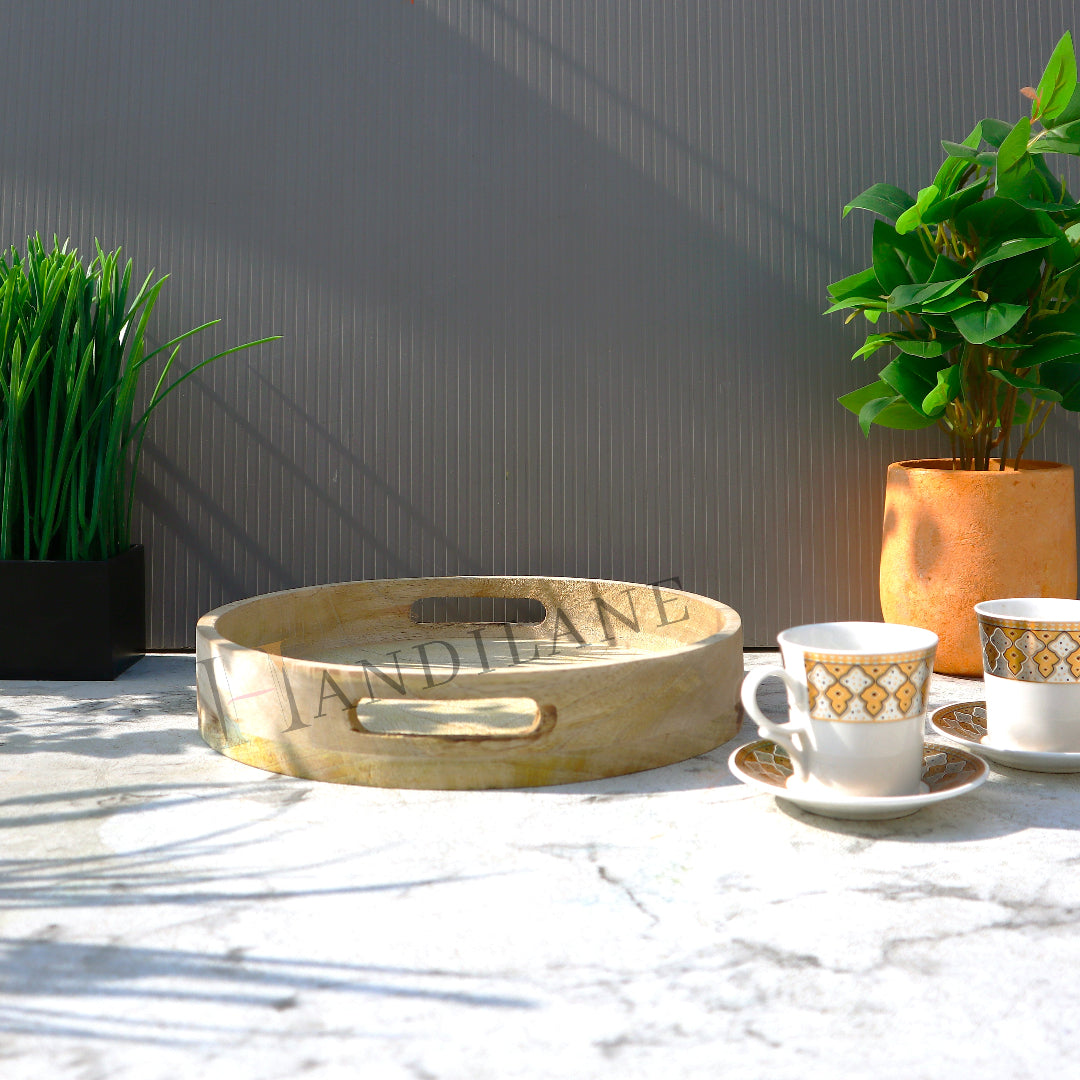 Serve up your style with this charming Circle Wooden Tray! Perfect for entertaining, this sleek tray is crafted from high-quality wood and features a unique circular shape.